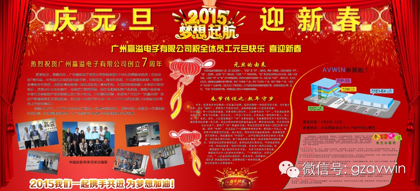 展望2015年,AVWIN全体同仁在新的一年里会继续努力,携手共进,给新的一年增添灵动的风景,收获最美的硕果!为广州赢溢电子有限公司辉煌的明天而奋搏!